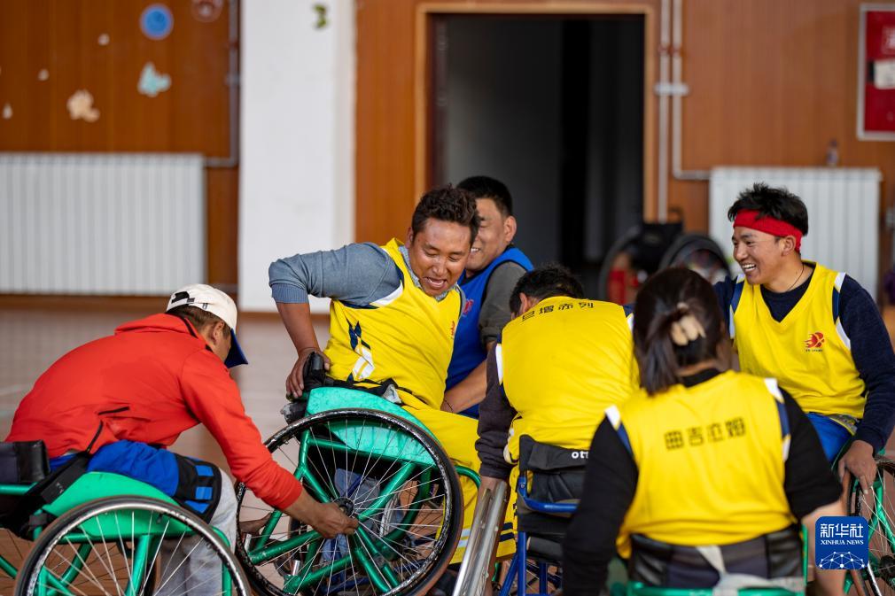 拉巴頓珠(右一)在拍攝輪椅籃球訓(xùn)練(11月26日攝)。新華社記者 姜帆 攝
