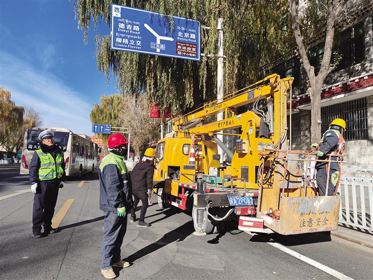 “結(jié)合拉薩市城鄉(xiāng)環(huán)境綜合大整治,我們在開展道路交通整治行動中,積極聯(lián)合園林部門對于道路兩旁樹枝遮擋交通信號燈、指示標牌和電子監(jiān)控探頭等問題進行全方位整改,此次整改點位155處,確保轄區(qū)道路交通安全暢通。在此,提醒廣大交通參與者,遇到修剪樹枝車輛,請減速慢行,確保交通安全。”拉薩市公安局交警支隊城南大隊副大隊長張浩表示。