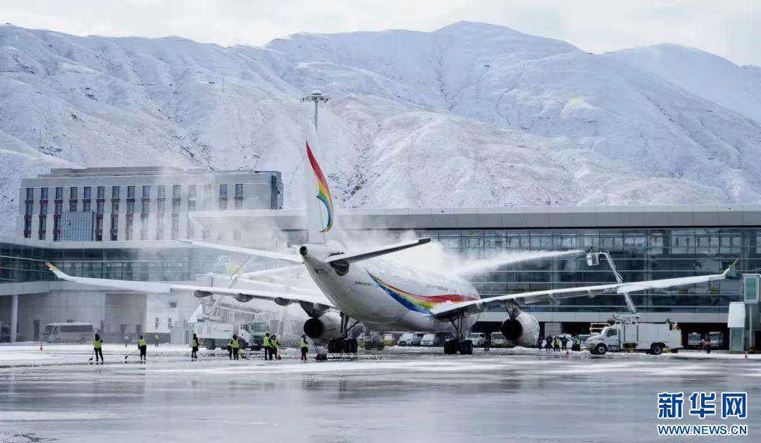 圖為拉薩貢嘎機(jī)場(chǎng)開展航空器除冰雪工作。新華網(wǎng) 白瑪群宗 攝