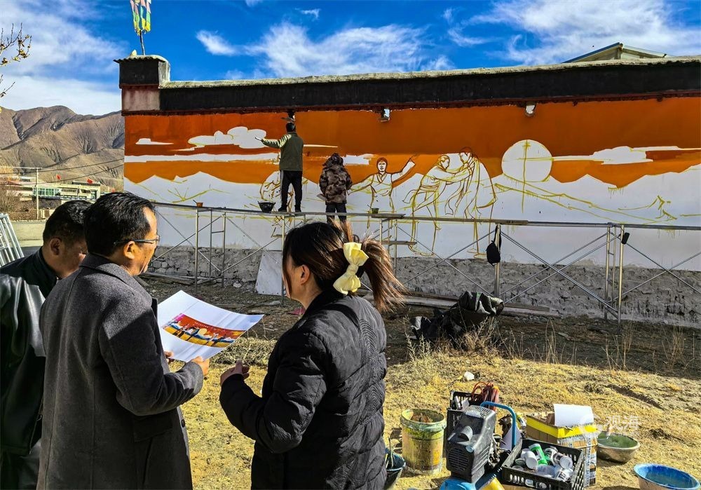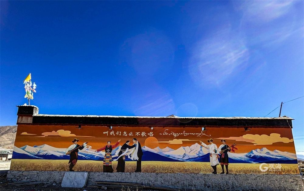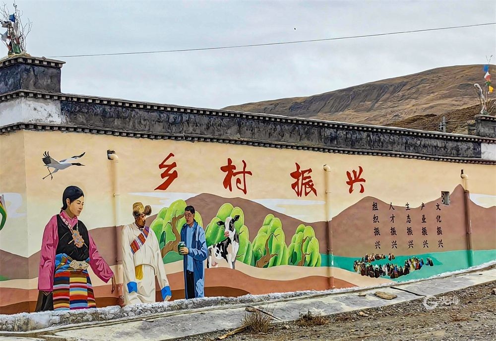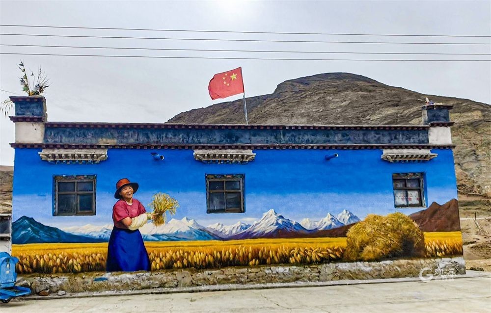廣袤的高原上,在連綿起伏的山巒之下,是藏族農(nóng)家趕著傳統(tǒng)的“二牛抬杠”耕耘的場(chǎng)景,旁邊的“阿佳”則撒下希望的青稞種子……這樣的場(chǎng)景當(dāng)然不會(huì)出現(xiàn)在現(xiàn)在這個(gè)滴水成冰的季節(jié),而是躍然于藏家傳統(tǒng)村居的院墻之上?!拔壹疫@面墻原來(lái)就是貼滿(mǎn)了牛糞,現(xiàn)在畫(huà)上了我們平時(shí)勞動(dòng)的景象,感覺(jué)比之前更好看了。”桑珠孜區(qū)東嘎鄉(xiāng)色定村的村民旦瓊說(shuō),此前的一年又一年,他都是把牛糞貼在墻上,固然有傳統(tǒng)的高原美感,但是與現(xiàn)在院墻上畫(huà)的鄉(xiāng)村振興的場(chǎng)景相比,還是現(xiàn)在的感覺(jué)更不錯(cuò)。