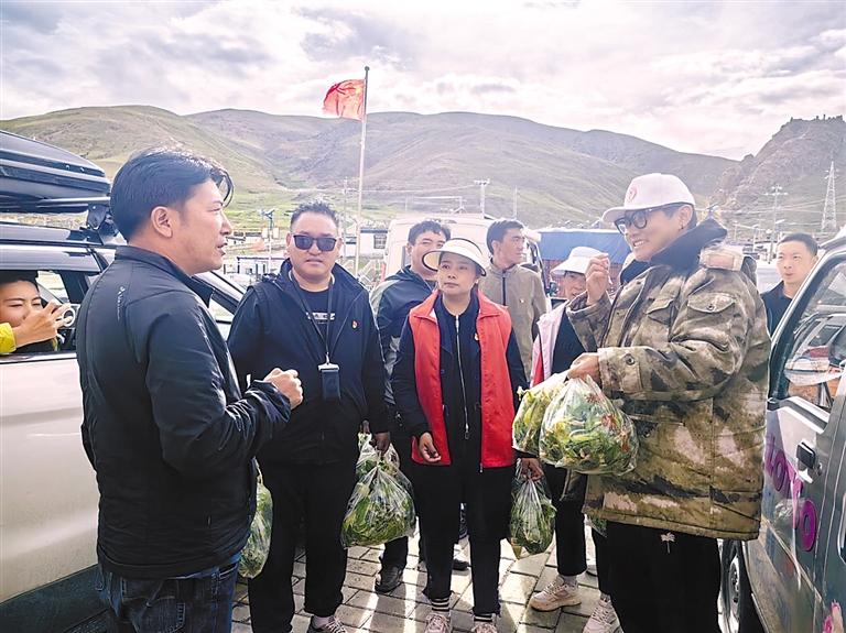 圖為薩嘎縣“紅色驛站”工作人員為騎行游客贈送蔬菜。扎西頓珠 攝