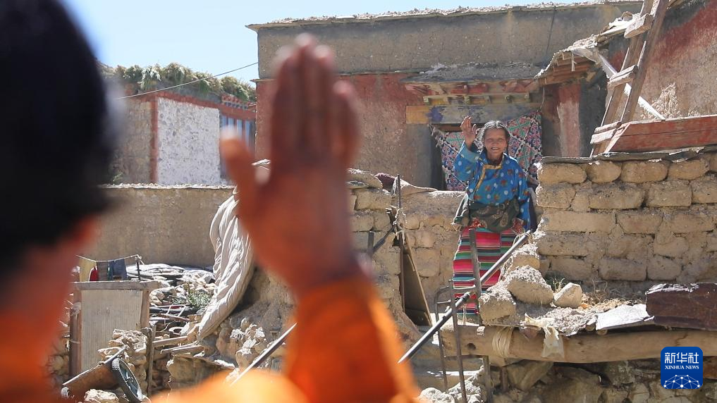 古曲扎巴為孤寡老人央珍(右)送去牛糞燃料后向她道別(2019年9月20日攝)。新華社發(fā)
