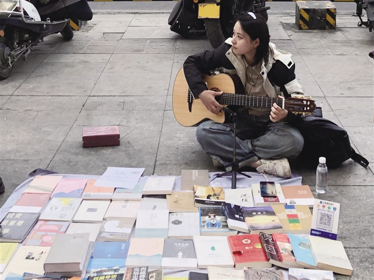 一般出攤時間是下午6點到9點,天氣暖和的話會到晚上10點左右才收攤。買書的顧客還是當?shù)氐哪贻p人多一點,游客倒沒有多少,生意也時好時壞,有時候一天能賣八九百元,有時候一晚上只能賣出去一本書。在沒有顧客的時候,方思潔就坐在攤位看書,“有時看了一半的書被顧客買走,我心里好著急,心想著還沒看完,想知道后面的故事。”她認為,擺地攤是展示自我的一種方式。