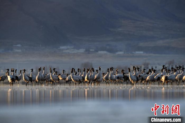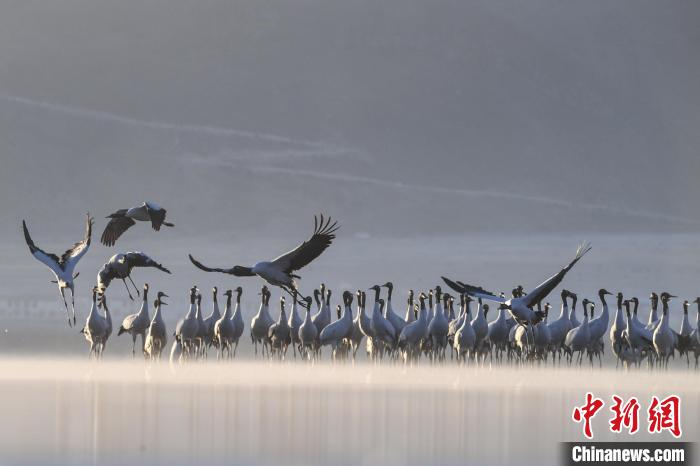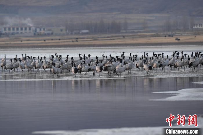 圖為拉薩市林周縣虎頭山水庫越冬的黑頸鶴。貢嘎來松 攝