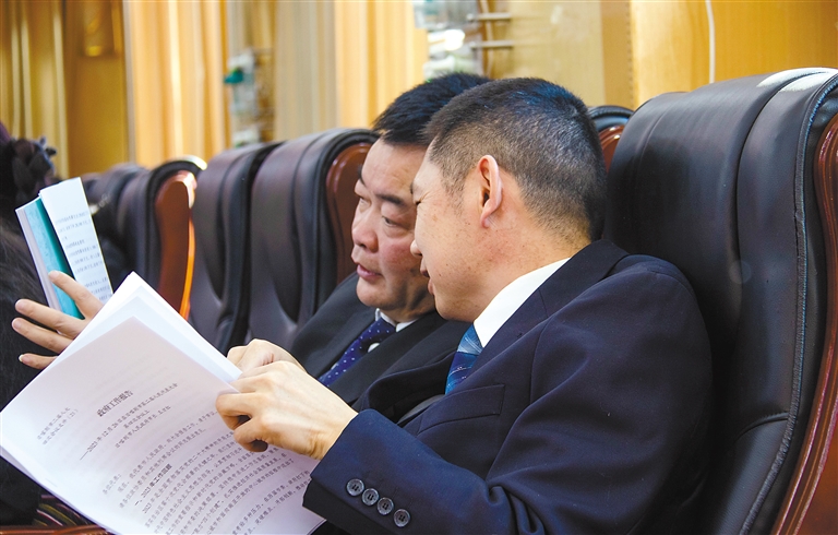 圖為參會(huì)前,市政協(xié)委員們?cè)陂喿x會(huì)議材料。