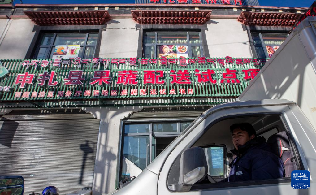 申扎縣供銷合作社的配送員巴拉從縣城總店出發(fā),為馬躍鄉(xiāng)貝嘎四村偏遠(yuǎn)鄉(xiāng)鎮(zhèn)果蔬配送試點(diǎn)項目直銷點(diǎn)運(yùn)送新鮮果蔬(1月5日攝)。新華社記者 姜帆 攝