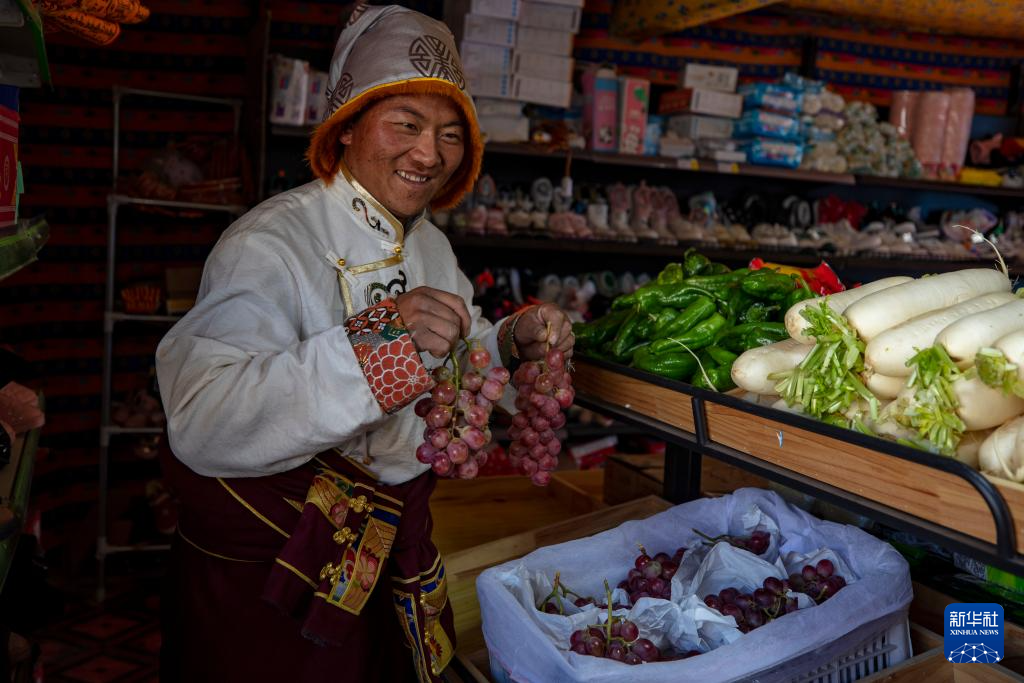 申扎縣馬躍鄉(xiāng)貝嘎四村偏遠(yuǎn)鄉(xiāng)鎮(zhèn)果蔬配送試點(diǎn)項目直銷點(diǎn)店主西熱加措在整理供銷合作社配送來的新鮮紅提(1月5日攝)。新華社記者 旦增尼瑪曲珠 攝