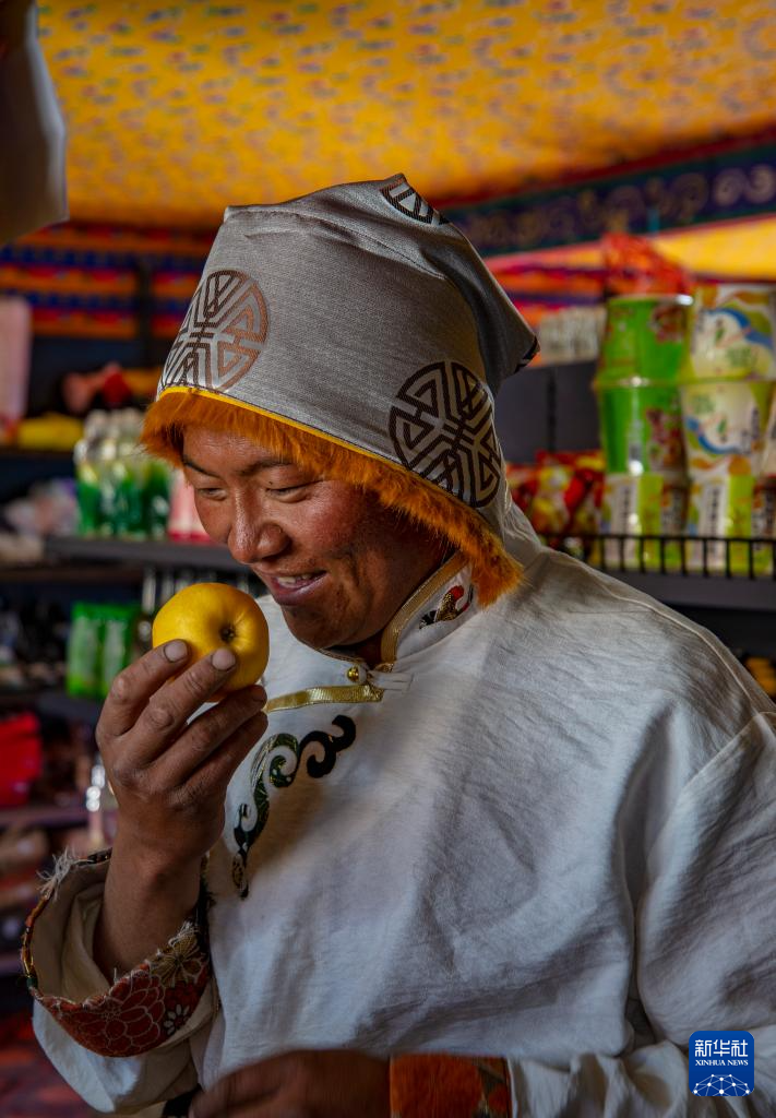 申扎縣馬躍鄉(xiāng)貝嘎四村偏遠(yuǎn)鄉(xiāng)鎮(zhèn)果蔬配送試點(diǎn)項目直銷點(diǎn)店主西熱加措拿起供銷合作社配送來的水果(1月5日攝)。新華社記者 姜帆 攝