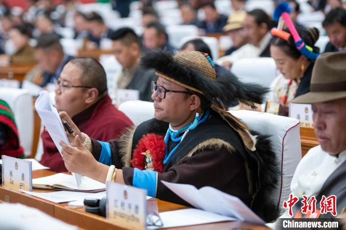 圖為西藏政協(xié)委員身著民族服飾參加開(kāi)幕會(huì)。貢嘎來(lái)松 攝