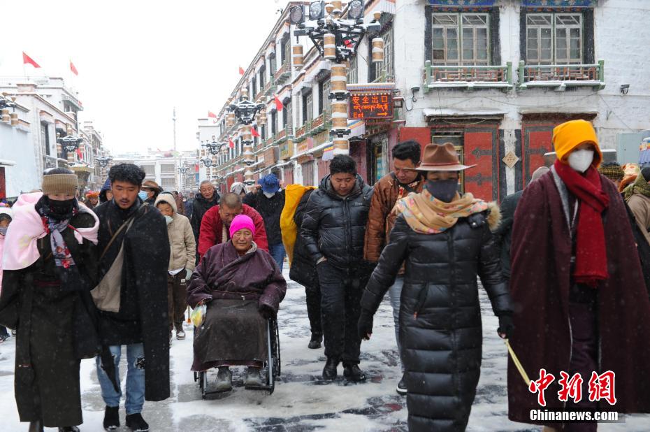 1月18日,西藏拉薩迎來(lái)一場(chǎng)大雪,雪后信眾在八廓街轉(zhuǎn)經(jīng)出行。布達(dá)拉宮銀裝素裹,分外美麗。圖為雪后信眾轉(zhuǎn)經(jīng)出行。