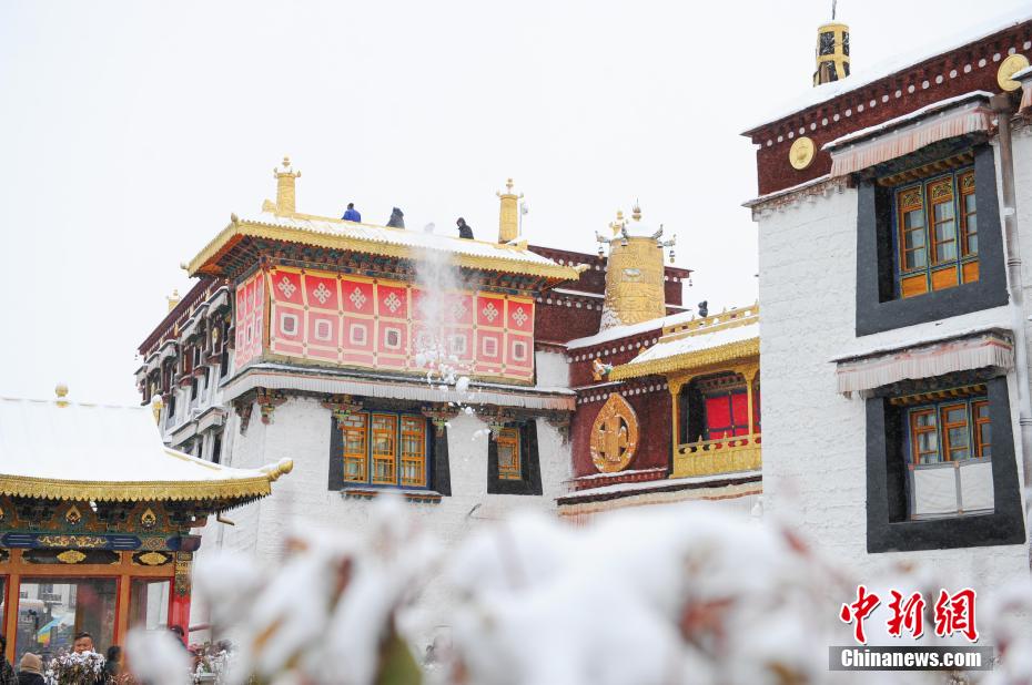 圖為雪后信眾在拉薩市大昭寺前朝拜。