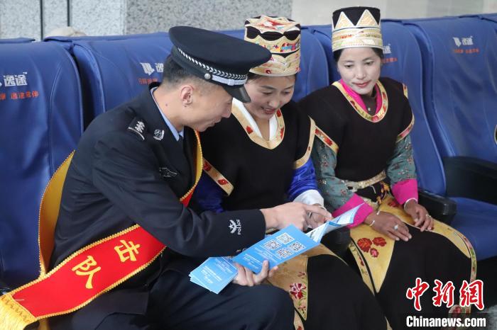 圖為拉薩站派出所民警向候車的旅客講解毒品的種類與危害。胡傳鑫 攝