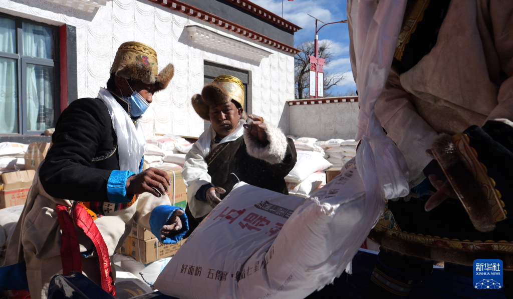 2月3日,努堆村2023年分紅大會(huì)現(xiàn)場(chǎng),村民們?cè)趯⒎旨t物資搬運(yùn)上車。新華社記者 格桑朗杰 攝