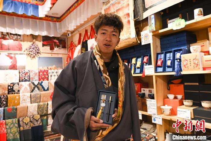 剛朝佛完的青科正和家人在店里挑選著文創(chuàng)產(chǎn)品,這位來自青海省果洛藏族自治州的年輕小伙,和家人來過拉薩很多次,但自駕來是首次。青科和哥哥挑選了很多文創(chuàng),其中有刻著藏文的鋼筆,“回去想送給我的老師”。