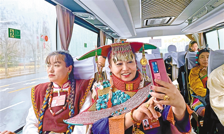 圖為全國人大代表格桑卓瑪乘車前往會(huì)場(chǎng)。記者 索朗群培 攝