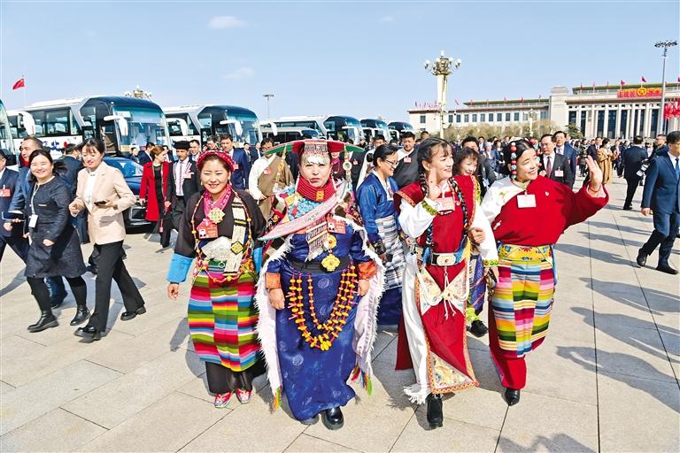 圖為西藏全國人大代表扎西江村(右)在西藏代表團全體會議上發(fā)言。旦增西旦 攝