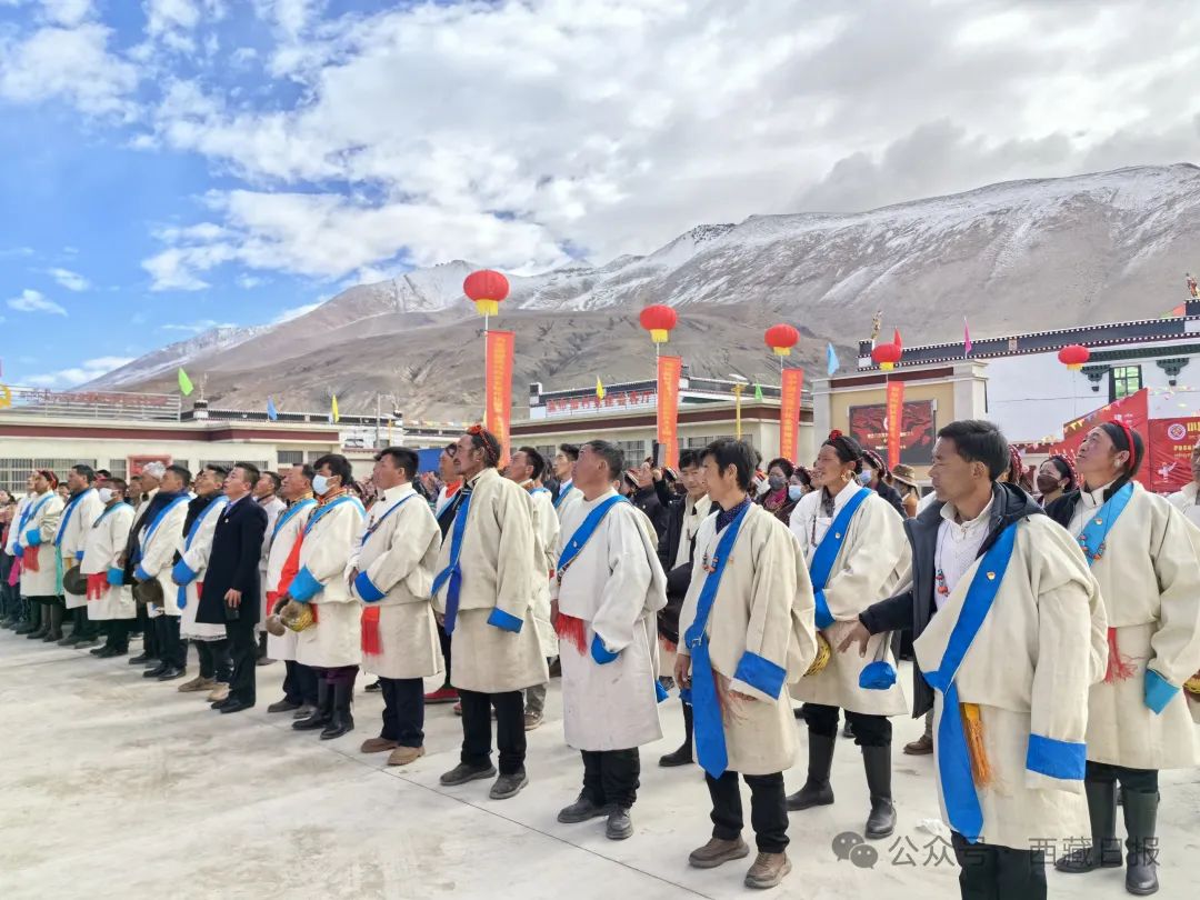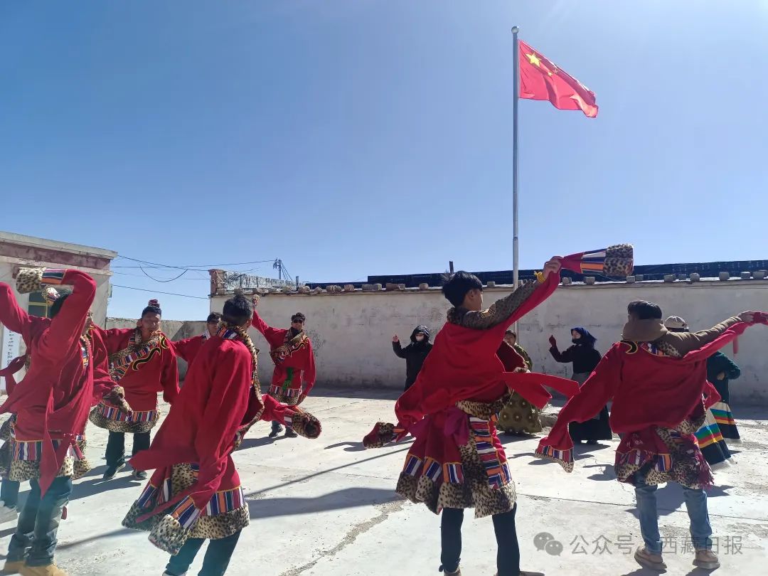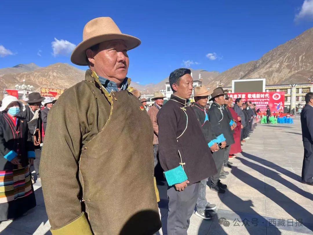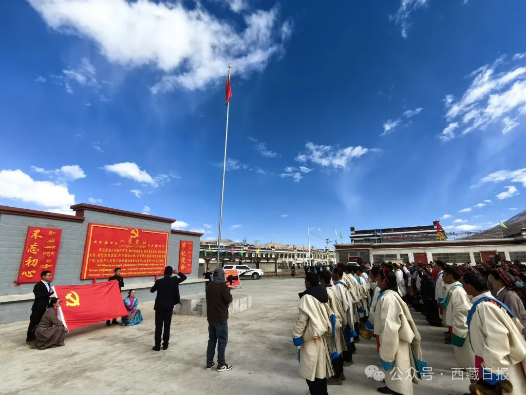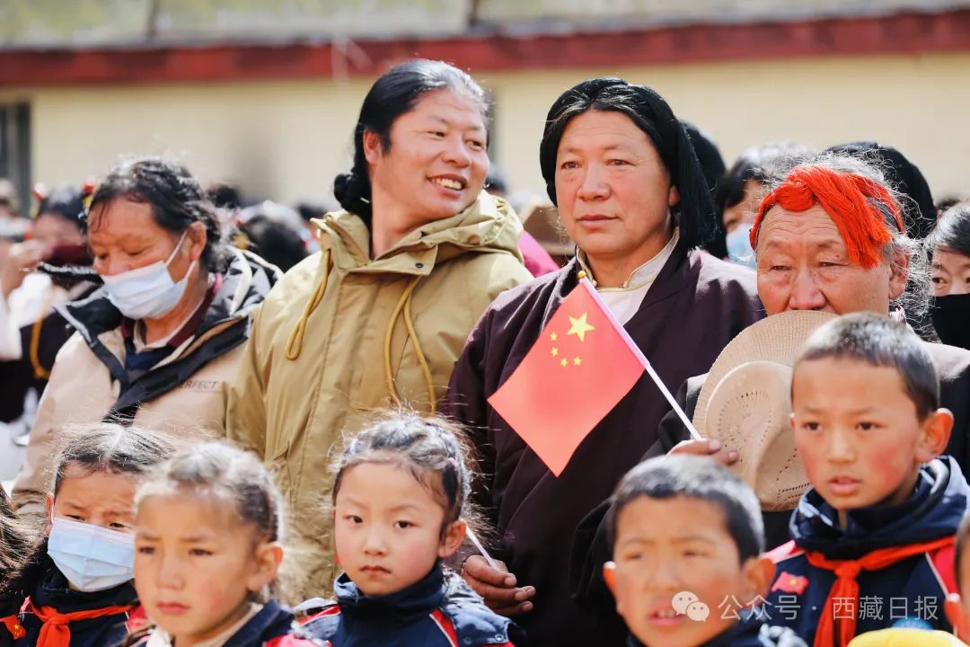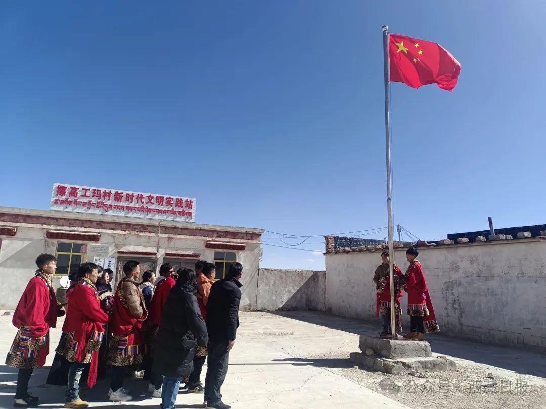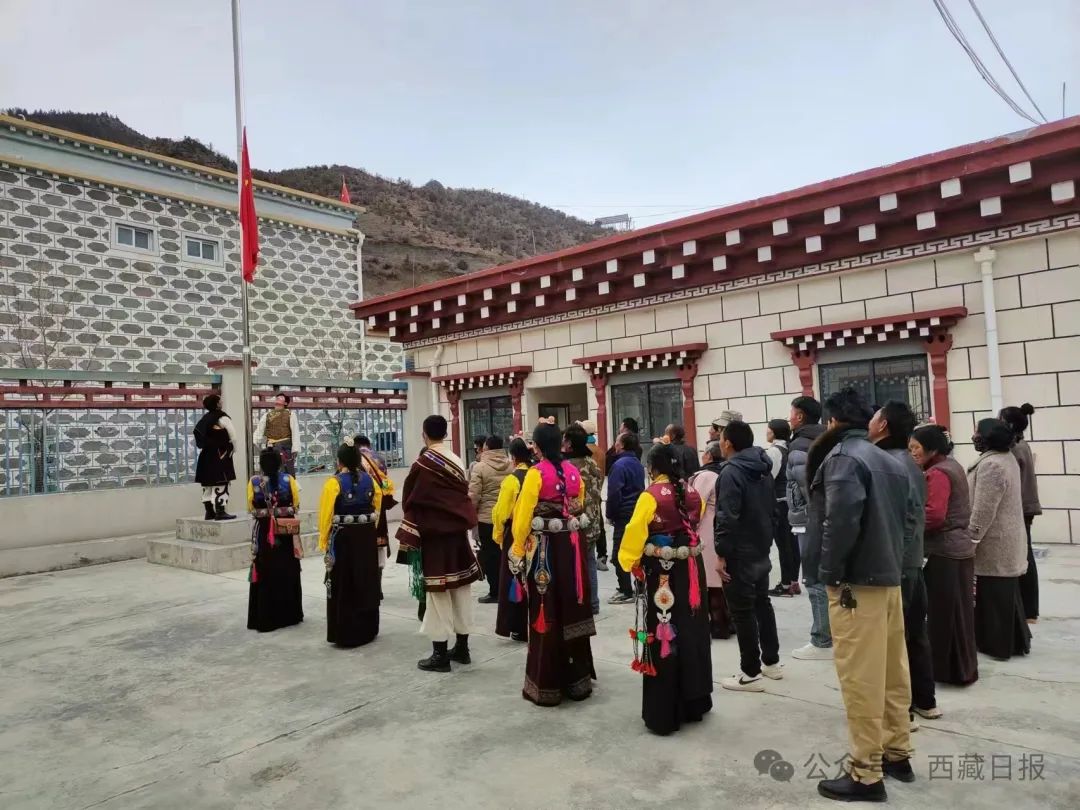日喀則市薩迦縣麻布加鄉(xiāng)舉行“叫我們怎么不歌唱”紀(jì)念西藏民主改革65周年升國旗唱國歌儀式。