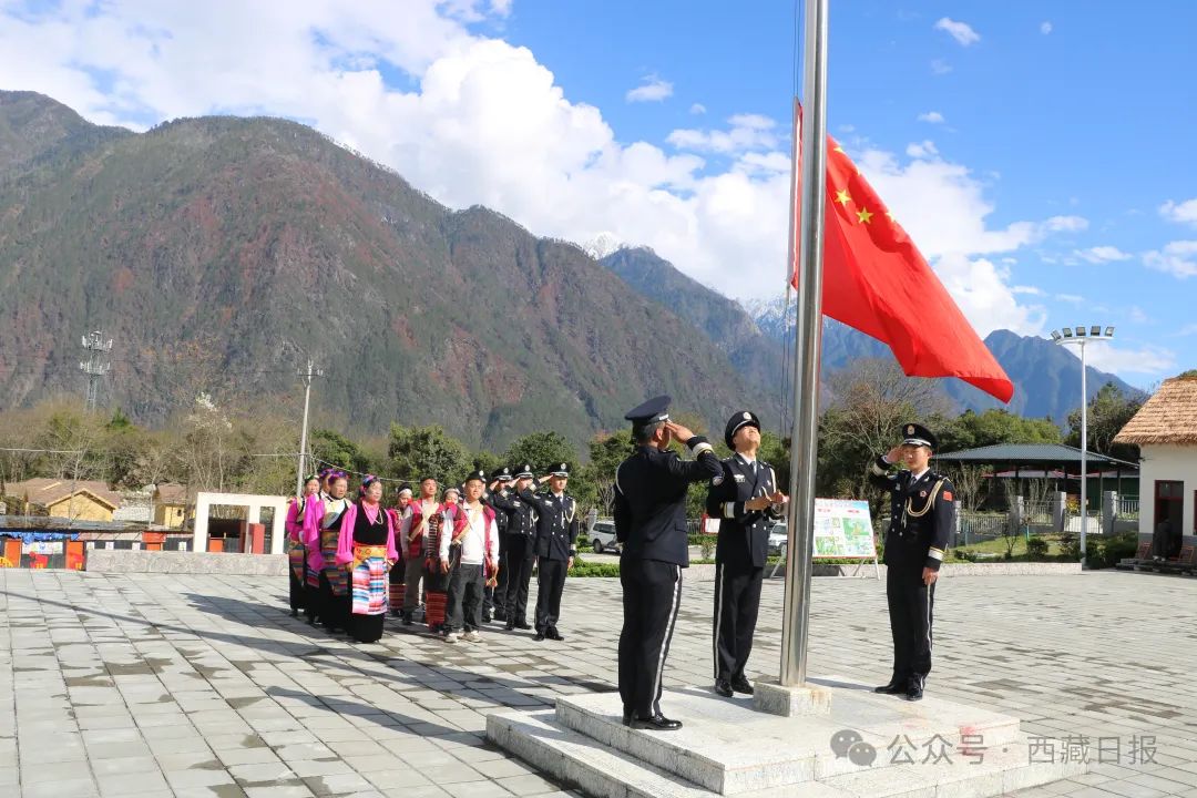 林芝邊境管理支隊(duì)竹瓦根邊境派出所與轄區(qū)干部群眾舉行紀(jì)念西藏百萬農(nóng)奴解放65周年升旗儀式。