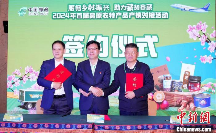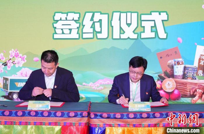 圖為中國郵政集團(tuán)有限公司西藏自治區(qū)分公司黨委書記、總經(jīng)理王樹橋(圖右)與西藏供銷集團(tuán)董事長王豐簽約。中國郵政集團(tuán)有限公司林芝市分公司供圖。