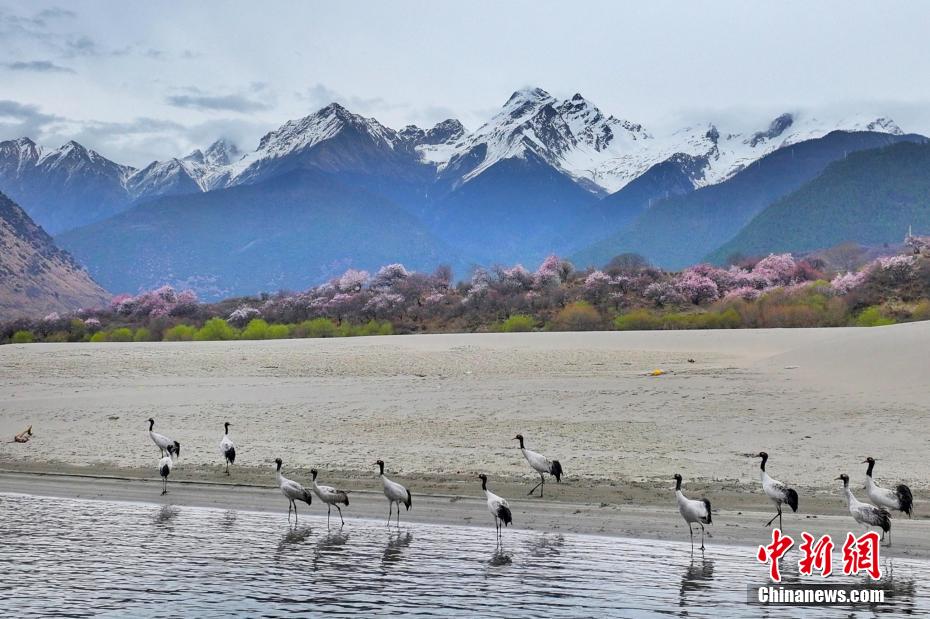 4月,在西藏林芝,遠處的雪山、綻放的桃花和水邊休憩的黑頸鶴構成一幅和諧美好的春日畫卷。圖為林芝市派鎮(zhèn)拍攝到的黑頸鶴。