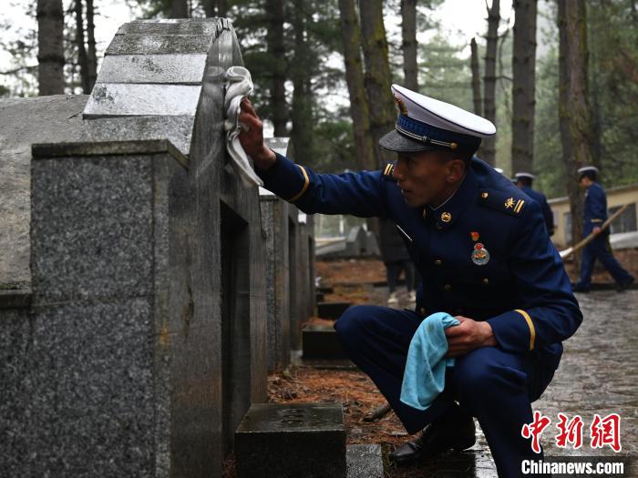 圖為波密中隊指戰(zhàn)員為烈士墓碑擦拭浮塵。林芝市森林消防支隊波密縣中隊供圖