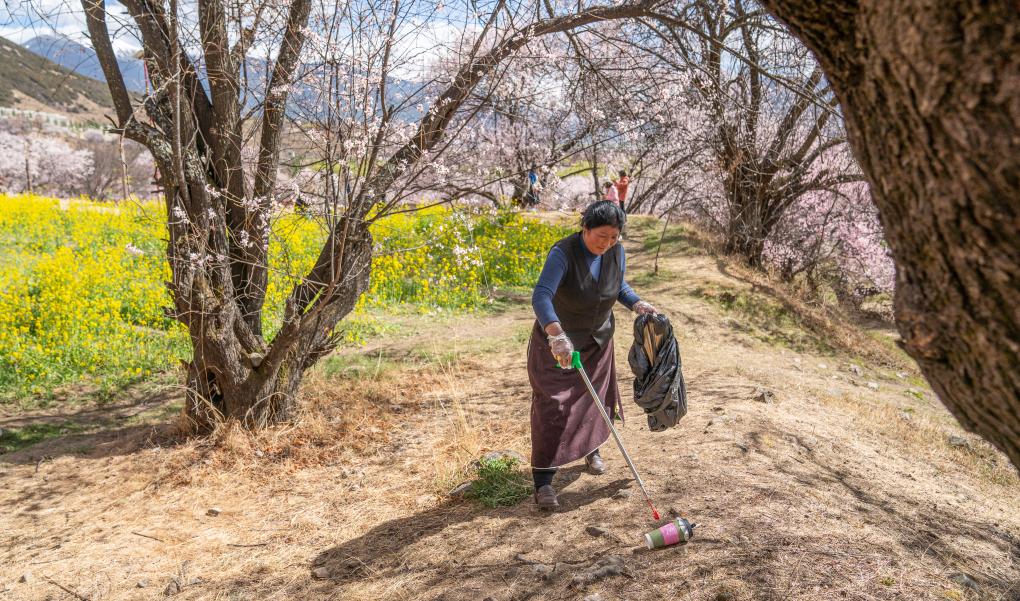 尼瑪曲吉在嘎拉村桃花園里撿拾垃圾。新華社記者丁增尼達 攝