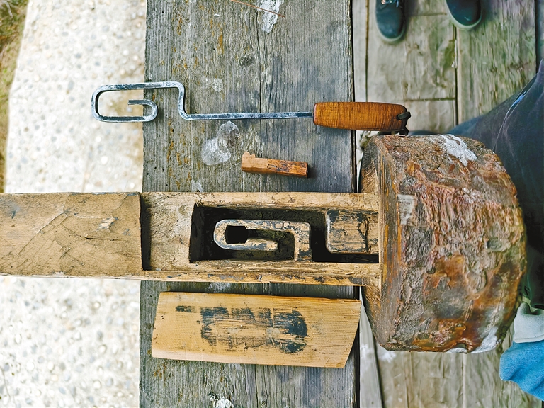 如此精致巧妙的木鎖怎么制作?我們又驅(qū)車來到了八蓋鄉(xiāng)巴瑞村,采訪了八蓋木鎖的第六代傳人次久羅布。他告訴我們,制作木鎖,首先要選一整塊的樺樹木,最好是結(jié)疤木,按照鎖的要求,用斧頭、鑿子將木頭削成圓形的鎖面和長方形的鎖芯,將鎖面和鎖芯之間掏空,留出鑰匙孔。在長方形的鎖芯中鑿出需要鑰匙進入的形狀,直至孔道與鑰匙嚴絲合縫。再將青岡木制成的栓子放進鎖芯前端被掏出的小孔中,并為鎖面覆上一層木板。這樣,一個木鎖便大致完成了。