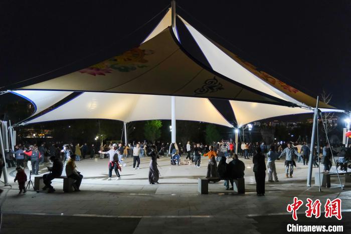 4月26日晚,在拉薩柳梧中心公園跳鍋莊舞的市民,現(xiàn)場熱鬧非常?!≈行律缬浾?江飛波 攝