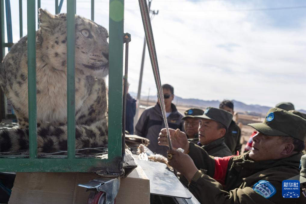 5月7日,尼瑪縣野生動物管護隊工作人員在羌塘國家級自然保護區(qū)核心區(qū)將雪豹放歸自然。新華社記者 姜帆 攝??