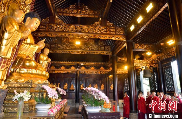 參觀結(jié)束后,少年活佛們返回主殿,在釋迦牟尼佛像前敬獻(xiàn)哈達(dá),同寬嚴(yán)法師一起誦經(jīng),共同祈愿國(guó)泰民安、世界和平。
