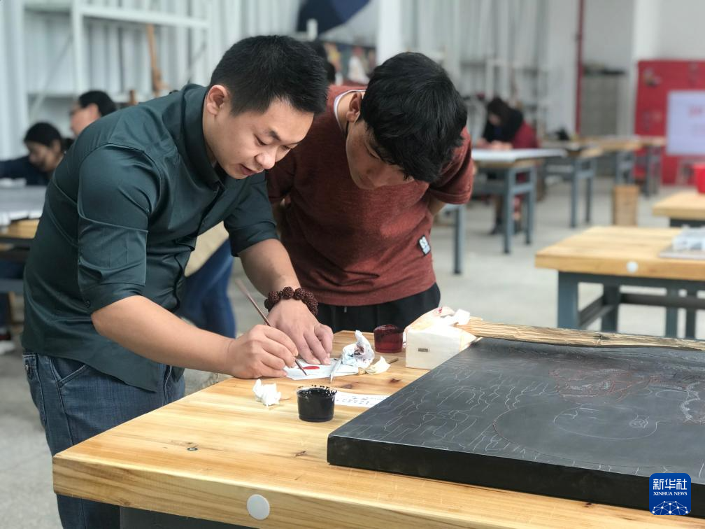 2018年,仁青郎加(右)正跟老師學(xué)習漆畫技法。新華社發(fā)