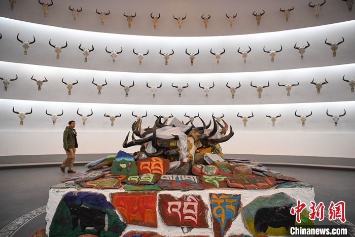 圖為西藏牦牛博物館感恩展廳內,墻上懸掛的牦牛頭骨。 中新社記者 貢嘎來松 攝