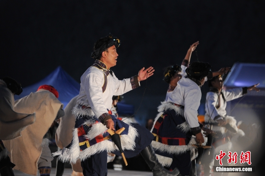 5月18日晚,西藏拉薩市當(dāng)雄縣納木錯(cuò)湖畔,當(dāng)?shù)啬撩駧в慰腕w驗(yàn)篝火鍋莊舞。納木錯(cuò),被譽(yù)為“天湖”,吸引著大量游客前來(lái)觀光。圖為篝火鍋莊舞晚會(huì)上的文藝演出。