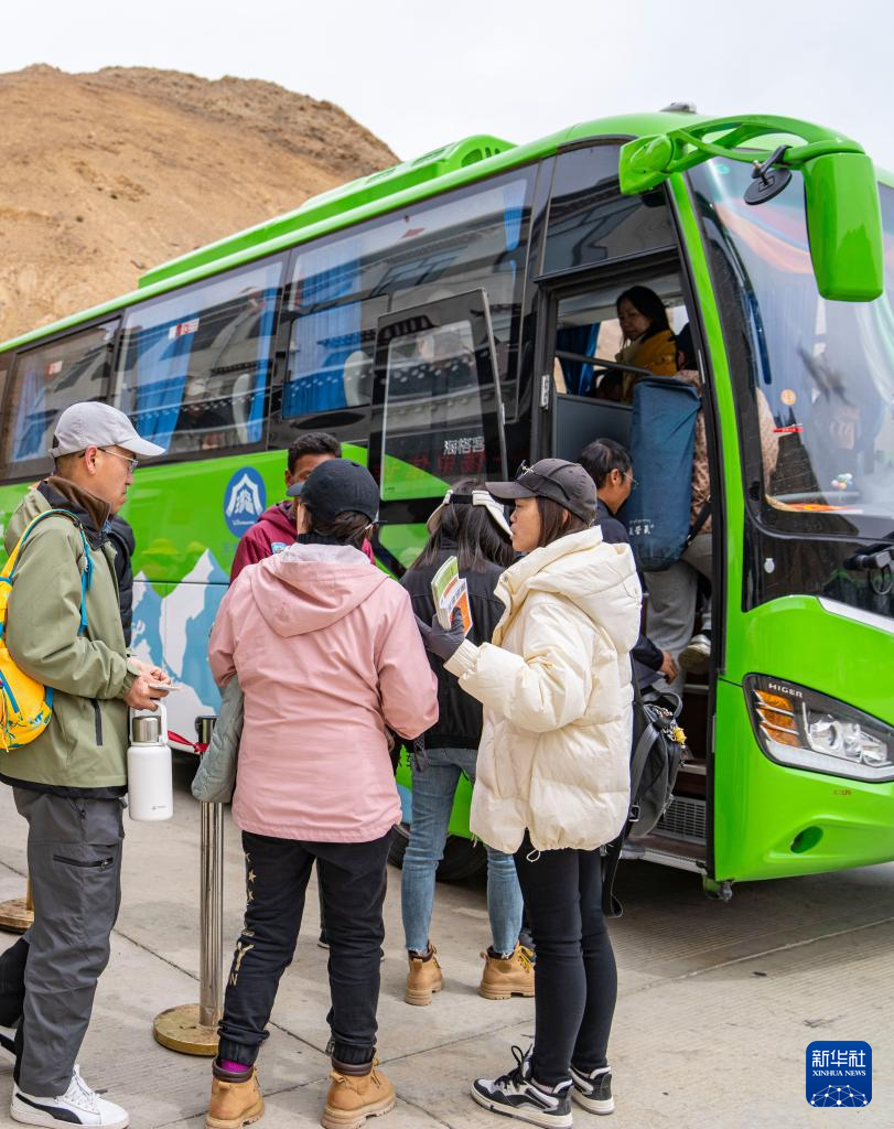 游客在珠穆朗瑪國(guó)家公園內(nèi)排隊(duì)換乘環(huán)保大巴車(5月20日攝)。