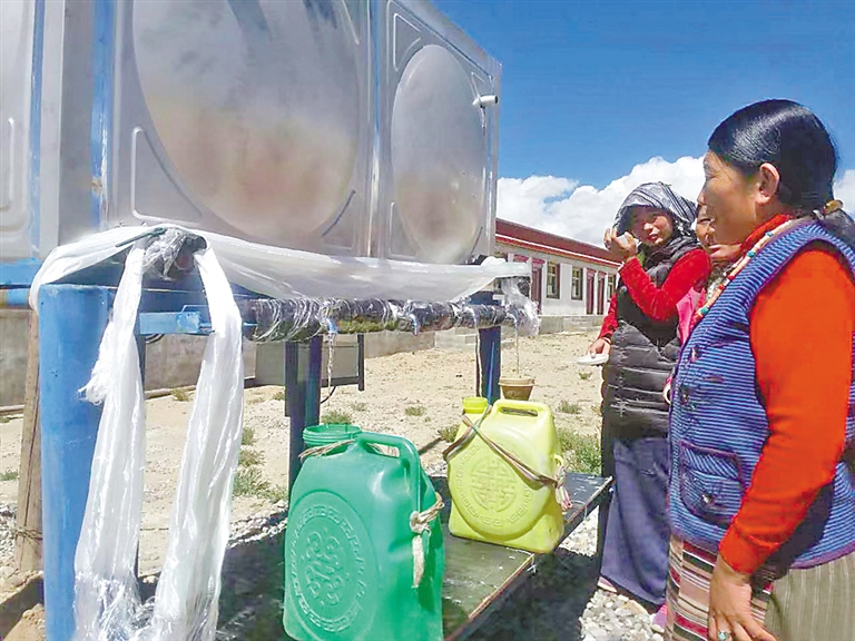 霍爾巴鄉(xiāng)群眾在中國電信西藏公司投資修建的扶貧項目機(jī)井取水。