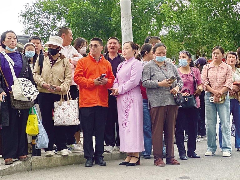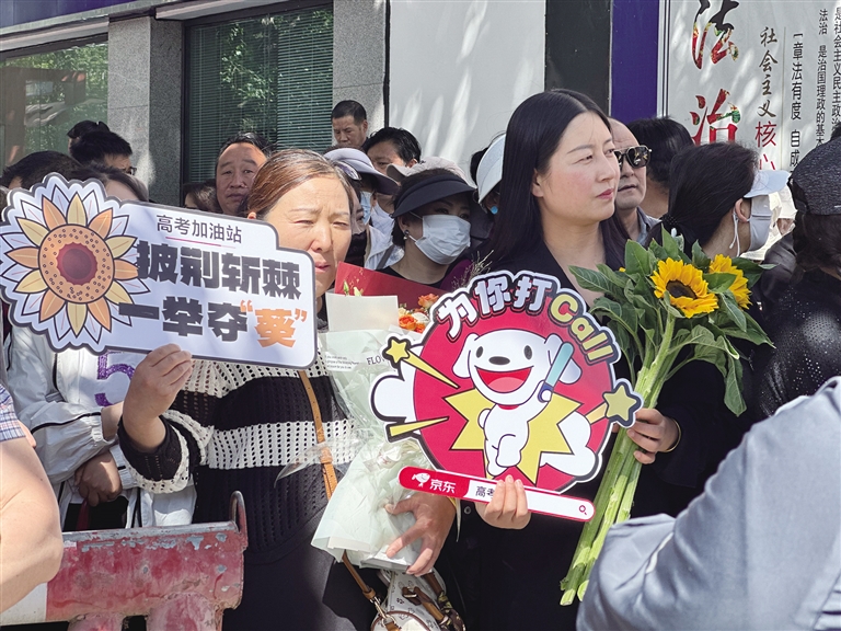 擊掌、擁抱……拉薩中學(xué)考點(diǎn)附近處處是為考生們加油的老師、家長(zhǎng)。有些家長(zhǎng)身著旗袍,有的老師手拿向日葵……給孩子加油打氣。
