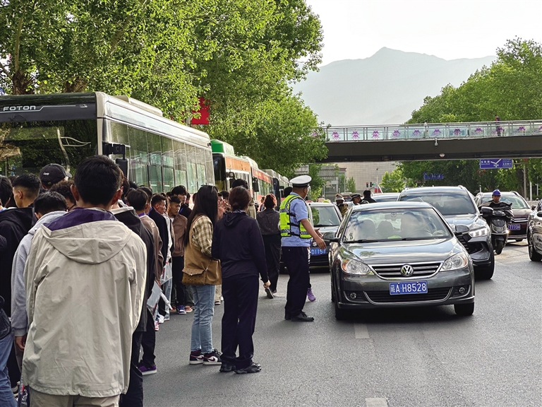 6月7日8點(diǎn),太陽(yáng)剛剛升起,拉薩中學(xué)考點(diǎn)附近人頭攢動(dòng)。一輛輛愛(ài)心送考的公交車(chē)依次??吭隈R路邊,學(xué)生們排隊(duì)等候安檢進(jìn)場(chǎng),考點(diǎn)大門(mén)口的喇叭重復(fù)播放著考生進(jìn)考場(chǎng)的溫馨提示。