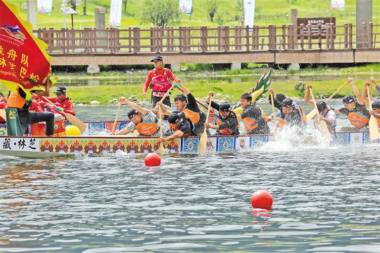 6月10日,2024年西藏林芝南迦巴瓦高原體育大會(huì)魯朗中尼高原龍舟友誼賽精彩上演。來自尼泊爾、新加坡和北京市、云南省以及拉薩市、林芝市等多地的8支龍舟隊(duì),百余名運(yùn)動(dòng)員奮力揮槳、激流勇進(jìn),為廣大群眾和游客獻(xiàn)上了一場水上競技的“大餐”。