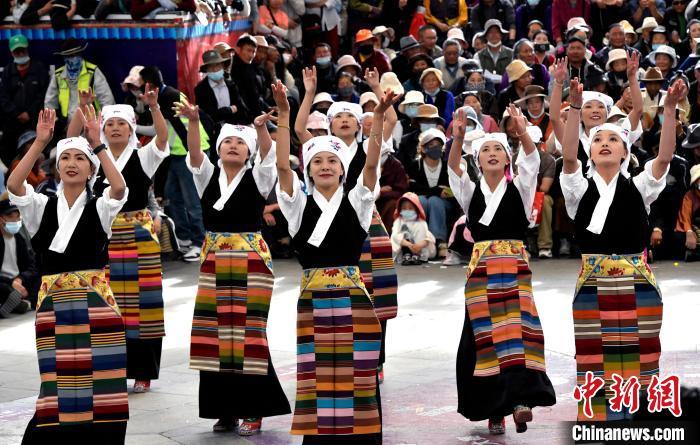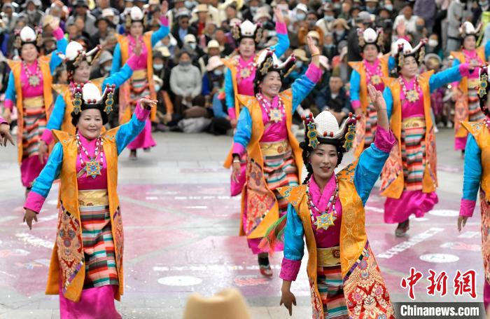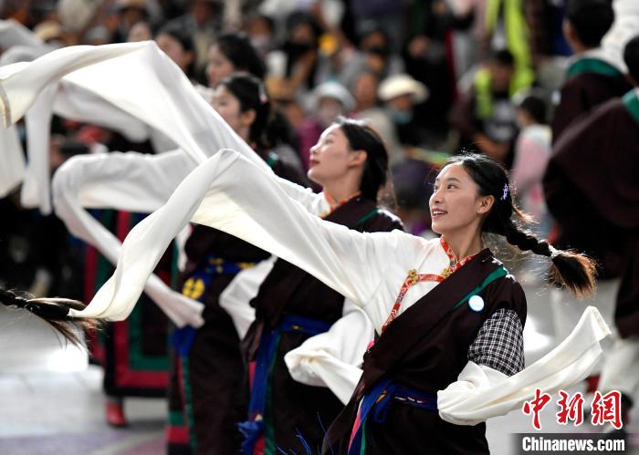 6月14日,第二屆拉薩鍋莊舞大賽決賽在布達(dá)拉宮腳下的宗角祿康公園舉辦,共有12支隊(duì)伍參賽。圖為鍋莊舞大賽決賽現(xiàn)場(chǎng)。中新社記者 李林 攝
