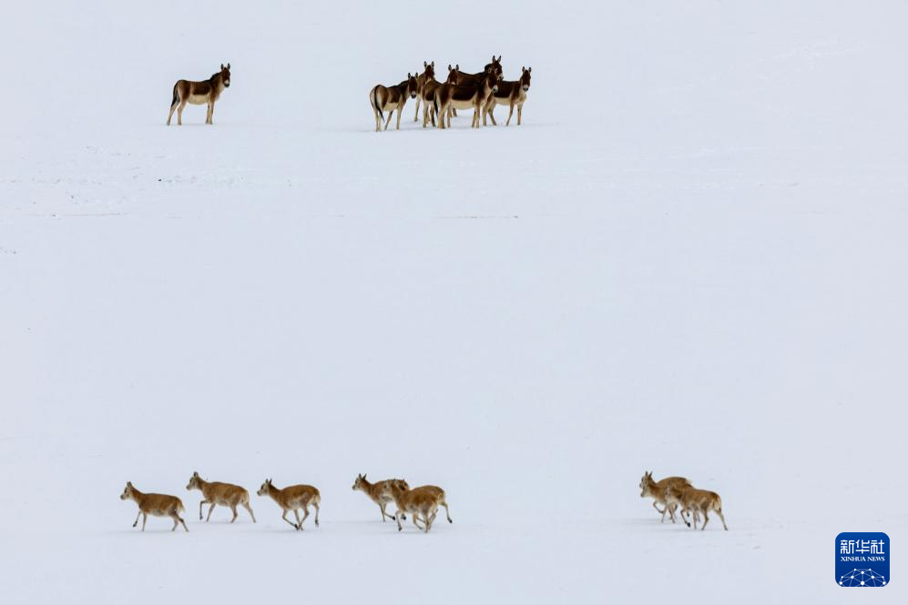 一群藏野驢在雪地中注視著遷徙的藏羚羊(5月8日攝)。新華社記者 姜帆 攝