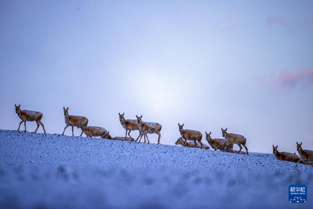 6月15日清晨雪后,在羌塘國(guó)家級(jí)自然保護(hù)區(qū),迎著朝霞前行在遷徙路上的一群藏羚羊。新華社記者 費(fèi)茂華 攝