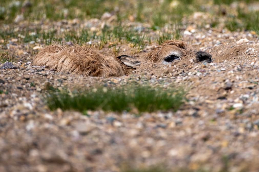 經(jīng)過6個(gè)月懷胎,它順利誕下一只黑褐色的小生命。小藏羚羊的臍帶剛剛斷開,無法站穩(wěn),母藏羚羊迅速跑開近百米,直到小藏羚羊身上沾滿砂石,搖搖晃晃地支撐起后腿,用黑色的鼻子輕嗅草地,它才回來舔舐孩子的身體。