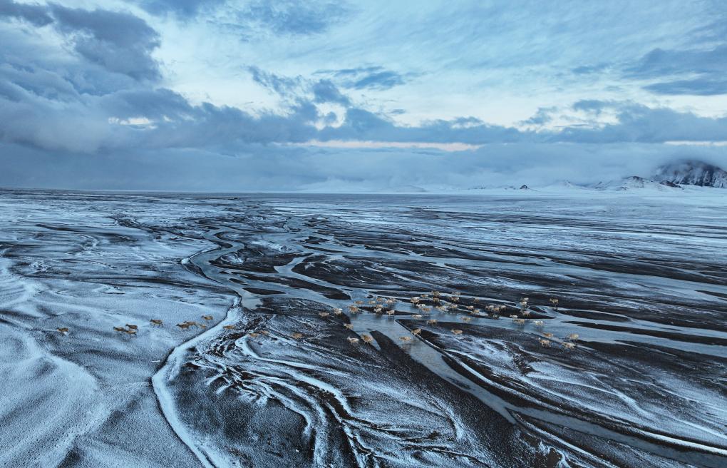 這是在甜水河畔荒灘雪地中向產(chǎn)羔地遷徙的藏羚羊(6月14日攝 無人機(jī)照片)。新華社記者 普布次仁 攝
