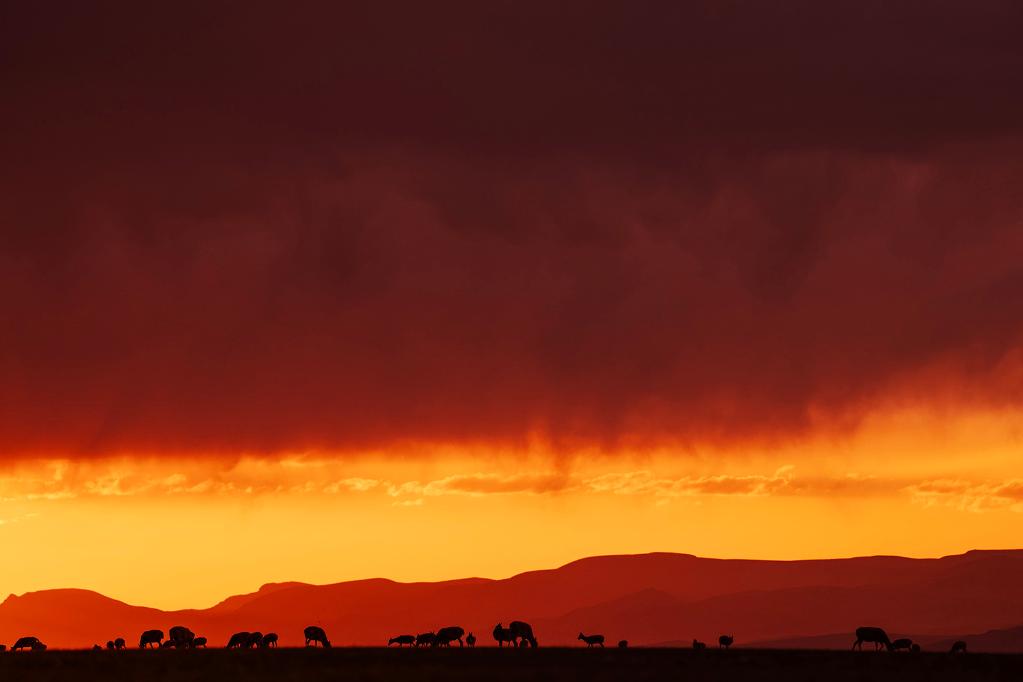 ↑ 在羌塘國家級自然保護區(qū),藏羚羊在夕陽下覓食。