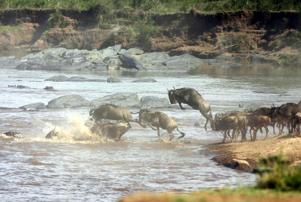 ↑ 在馬賽馬拉國家保護區(qū),遷徙中的角馬越過馬拉河。