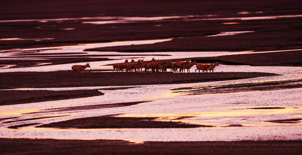 ↑ 在羌塘國家級自然保護區(qū),藏羚羊越過甜水河,前往“產(chǎn)房”。