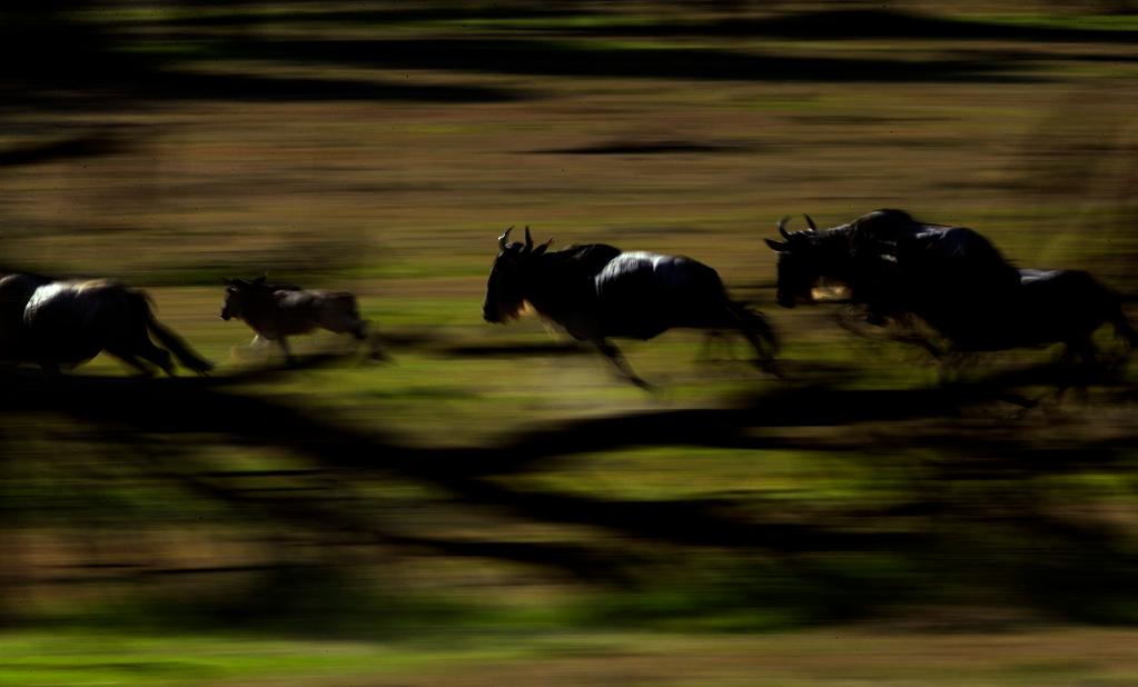 ↑ 在馬賽馬拉國家保護區(qū),遷徙中的角馬因為感受到某種危險而奮力奔跑。