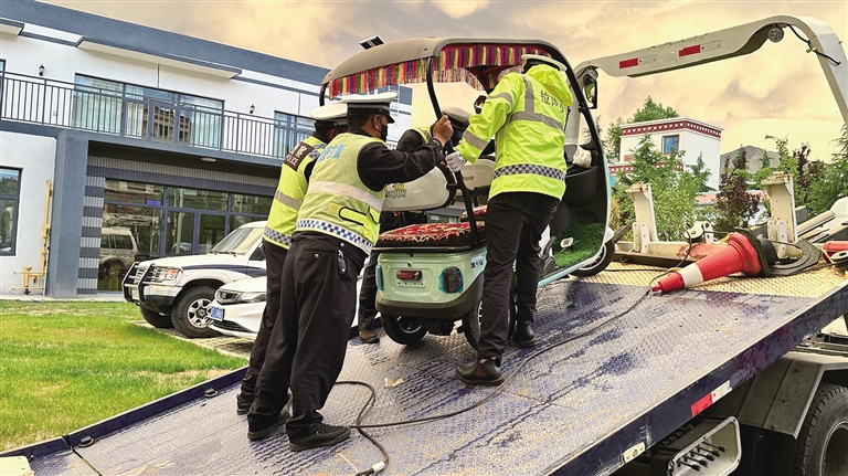 6月19日18時(shí)許,記者來到拉薩市城關(guān)區(qū)江蘇東路與嘎瑪貢桑路交叉口,此時(shí)正值下班高峰期,各類車輛川流不息,十分繁忙,拉薩市公安局交警支隊(duì)城南大隊(duì)的民警們一邊疏導(dǎo)交通,一邊開展電動(dòng)三輪、四輪車專項(xiàng)整治行動(dòng)。沒過多久,一輛電動(dòng)三輪車準(zhǔn)備通過路口,民警丹增發(fā)現(xiàn)該車輛存在非法改裝現(xiàn)象,便立即上前將車輛引導(dǎo)至安全位置,檢查后發(fā)現(xiàn)駕駛?cè)怂阶詾檐囕v加裝遮陽篷,上路行駛存在較大安全隱患,便按照相關(guān)法律法規(guī)暫扣車輛。丹增告訴記者:“我們會(huì)將暫扣的車輛統(tǒng)一停放,等駕駛?cè)私邮芴幜P并提交相關(guān)資料后,才能領(lǐng)回車輛?!?/p>