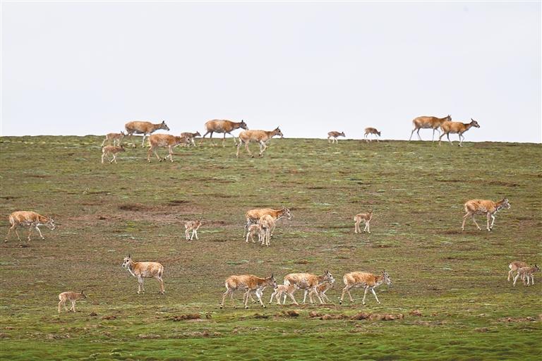 卓乃湖位于世界自然遺產(chǎn)地可可西里腹地。今年5月以來,來自青海三江源、新疆阿爾金山、西藏羌塘等地的雌性藏羚羊陸續(xù)遷徙至卓乃湖區(qū)域產(chǎn)仔。7月下旬開始,產(chǎn)仔結(jié)束后的雌性藏羚羊?qū)⒃贁y幼仔返回原棲息地。