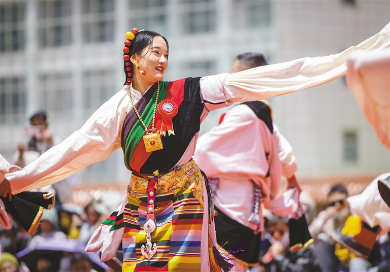 身著特色藏族服飾的巴青縣群眾在“鄉(xiāng)村振興 那曲奮進(jìn)”傳統(tǒng)舞蹈大賽上表演舞蹈。萬(wàn)靖 攝